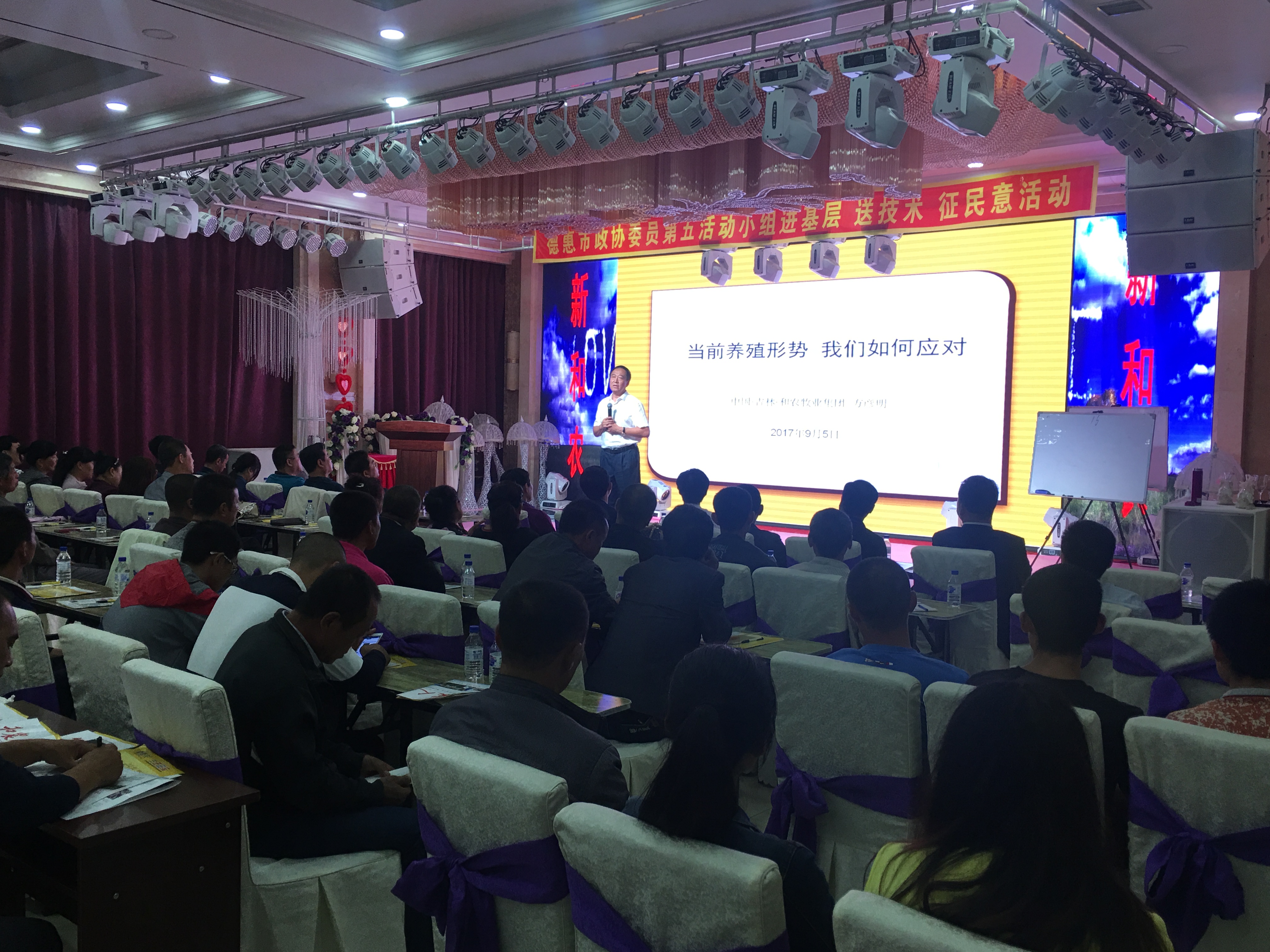 由和農(nóng)牧業(yè)集團主辦,德惠榮豐聯(lián)社、德惠市政協(xié)委員會協(xié)辦“新和農(nóng)蛋雞養(yǎng)殖雙卡新模式”送溫暖傳技術基層科普推介會在德惠華宴大酒店隆重召開,現(xiàn)場參會大型養(yǎng)殖場120人。