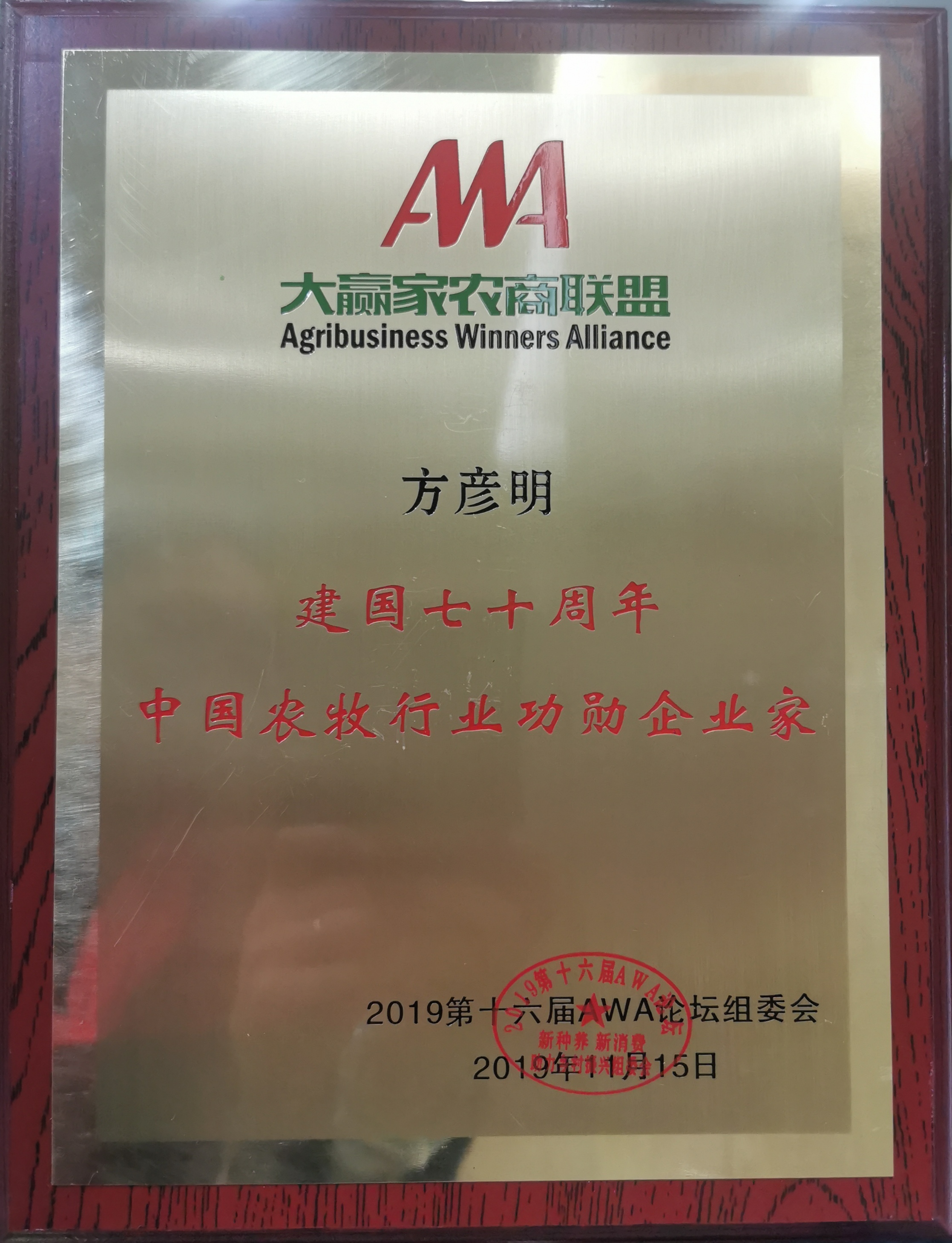 11月14-16日,由鄉(xiāng)村振興實(shí)施路徑研究國(guó)家重大課題組和AWA大贏家農(nóng)商聯(lián)盟主辦的2019第十六屆大贏家(AWA)論壇在北京市中國(guó)人民大學(xué)逸夫會(huì)議中心隆重召開,吉林和農(nóng)牧業(yè)集團(tuán)董事長(zhǎng)方彥明先生榮獲建國(guó)70周年中國(guó)農(nóng)牧行業(yè)功勛企業(yè)家。